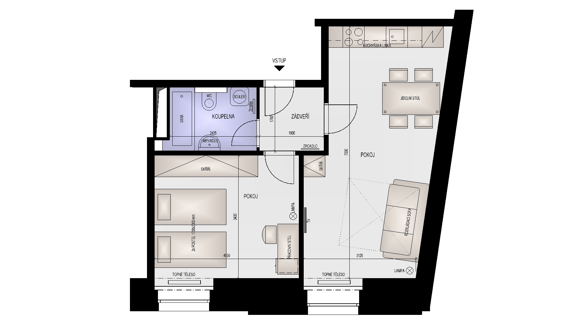 Celková výměra bytu je 45,1 m2. Předsíně 3,2 m2, koupelna 4,3 m2, pokoj s kuchyňským koutem 23,47 m2. Ložnice se samostatným vstupem z předsíně je o výměře 14,12 m2. Okna jsou situovány na severní stranu do ulice Bratislavská.