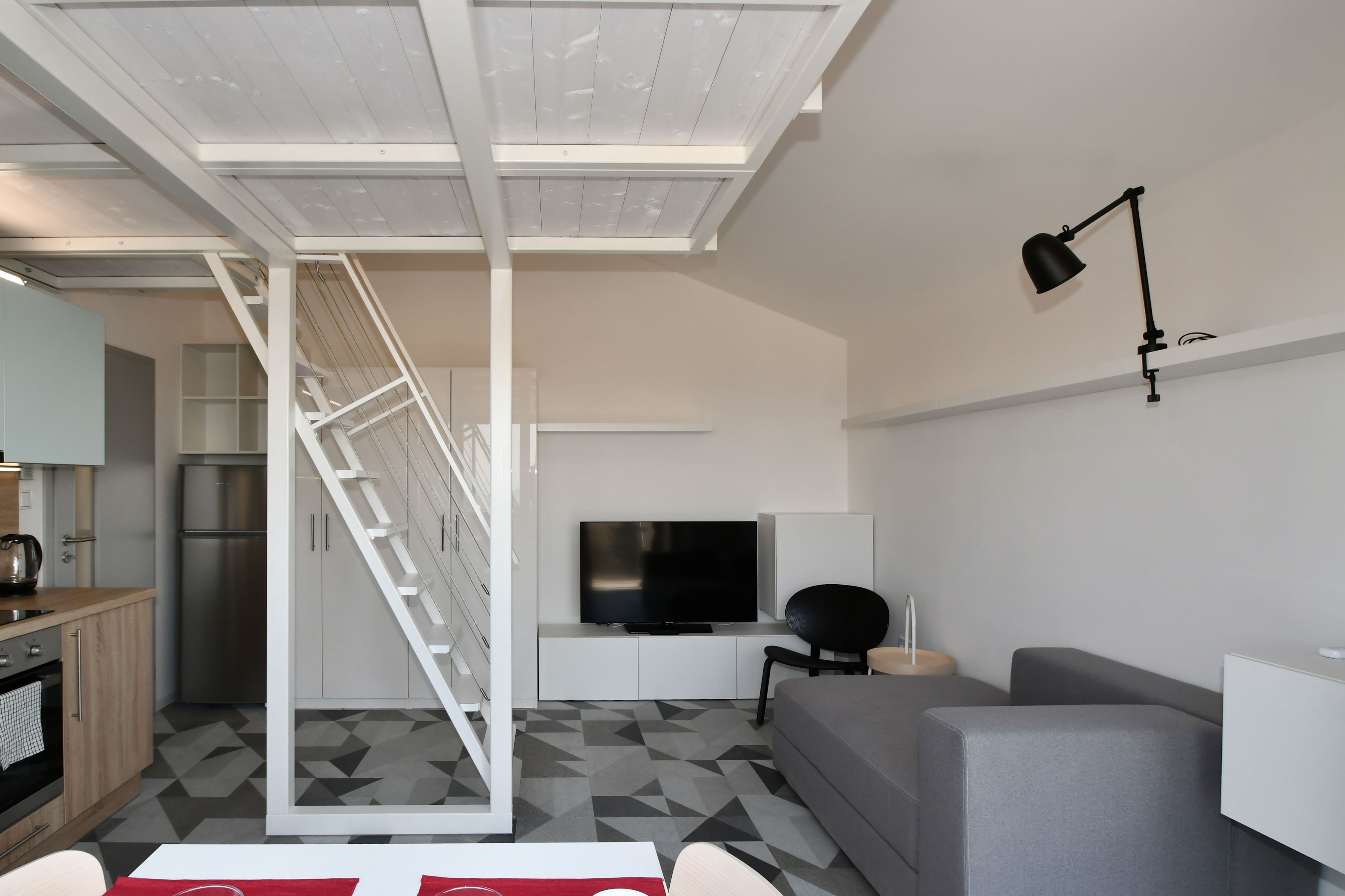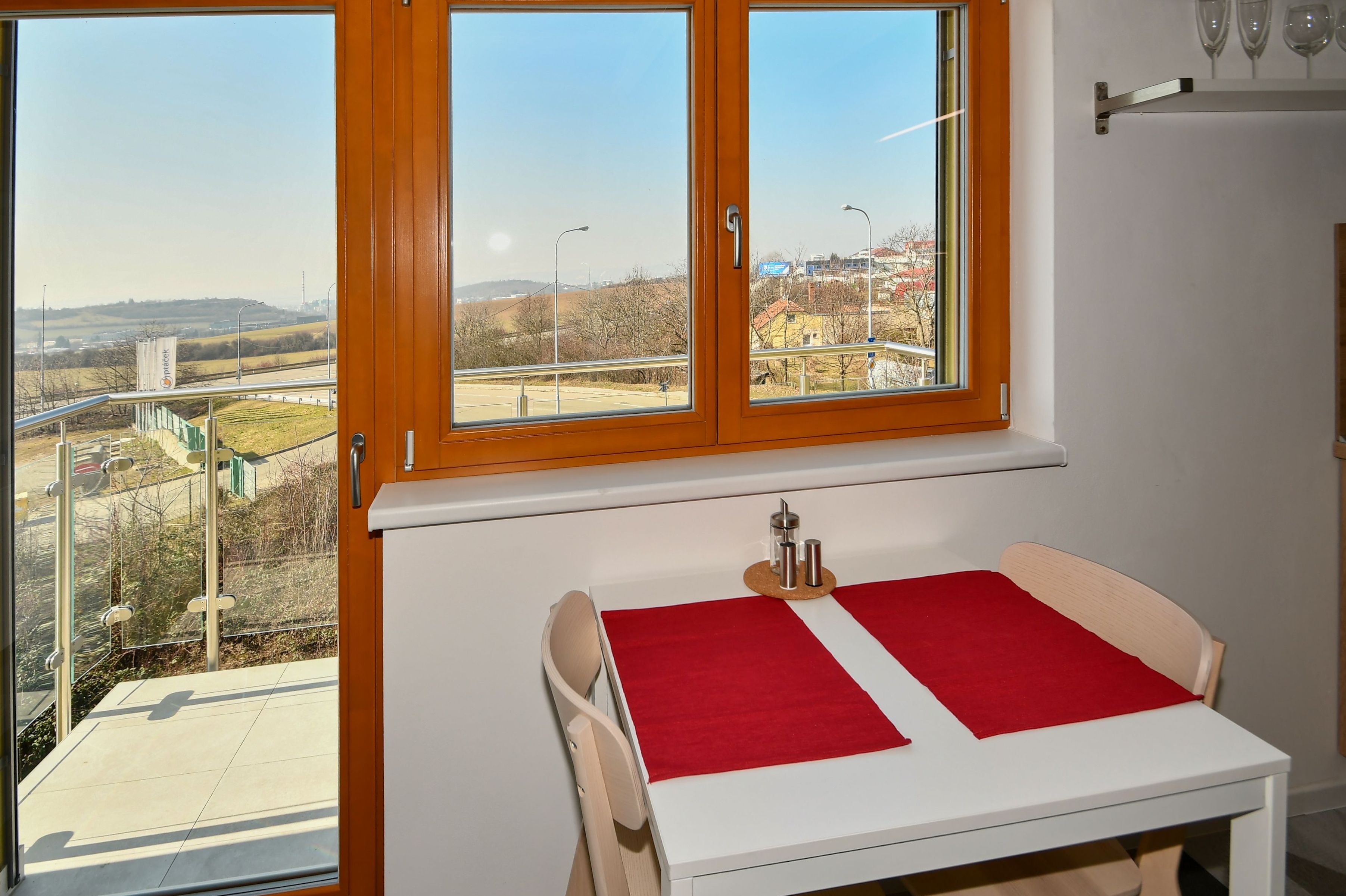 Byt je umístěn ve druhém patře a je přístupný z venkovní otevřené pavlače bytového domu. Obývací pokoj s kuchyňským koutem (19,3 m2) obsahuje toto zařízení: Kuchyňskou linku včetně spotřebičů, sporák s indukční varnou deskou a s horkovzdušnou elektrickou troubou, digestoř, mikrovlnná trouba, myčka nádobí, dřez. Další bytové zařízení je: lednice s mrazákem, pohovka, křeslo, konferenční stolek, TV stolek s televizí, šatní skříně, police, rozkládací kuchyňský stůl a dvě židle. Pro spaní slouží dvoulůžko umístěné na konstrukci vloženého mezipatra, která je umístěna nad prostorem kuchyňské linky. Z pokoje lze vejít na balkón (2,5 m2), který je orientována na západní stranu s nádherným výhledem na město Brno.