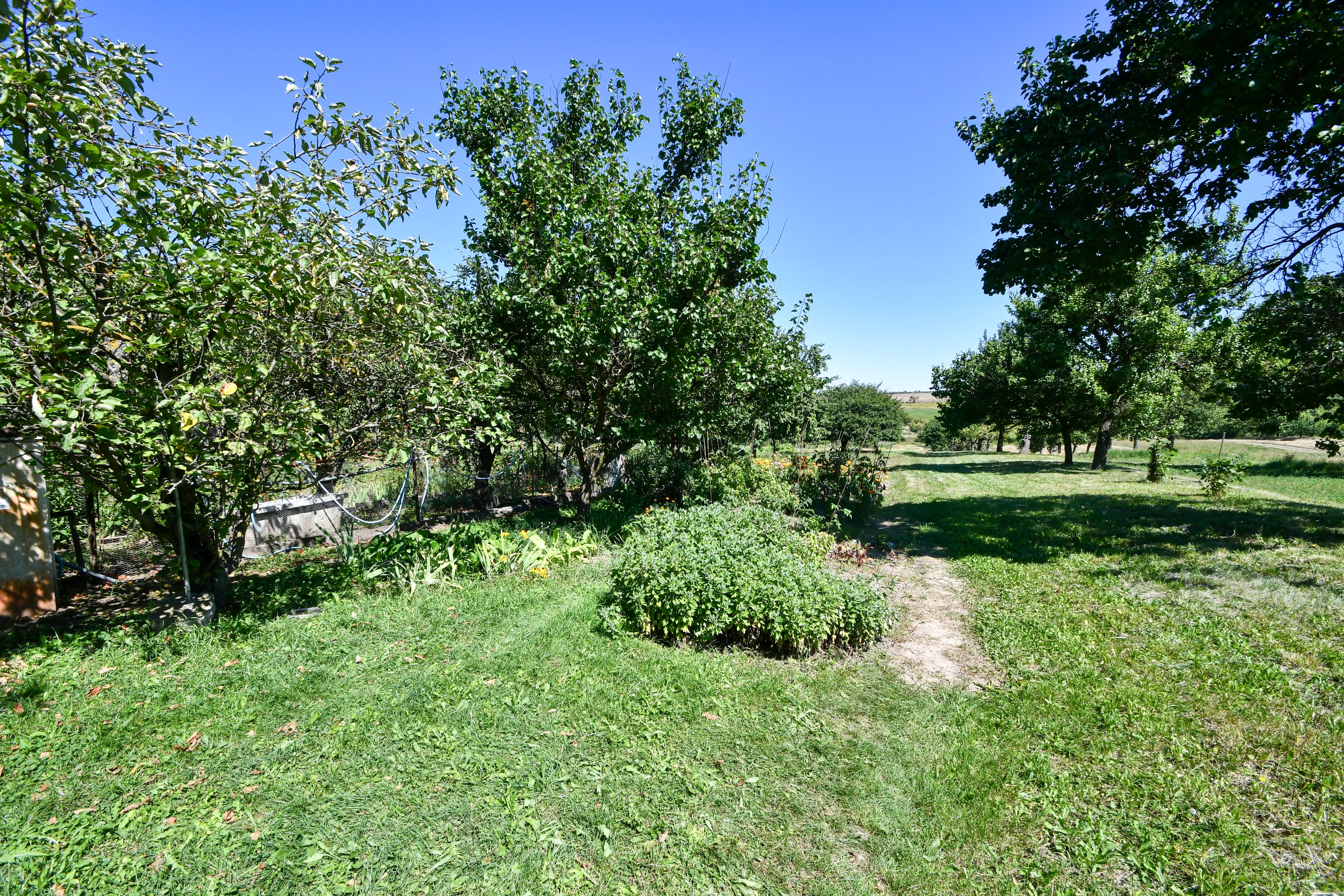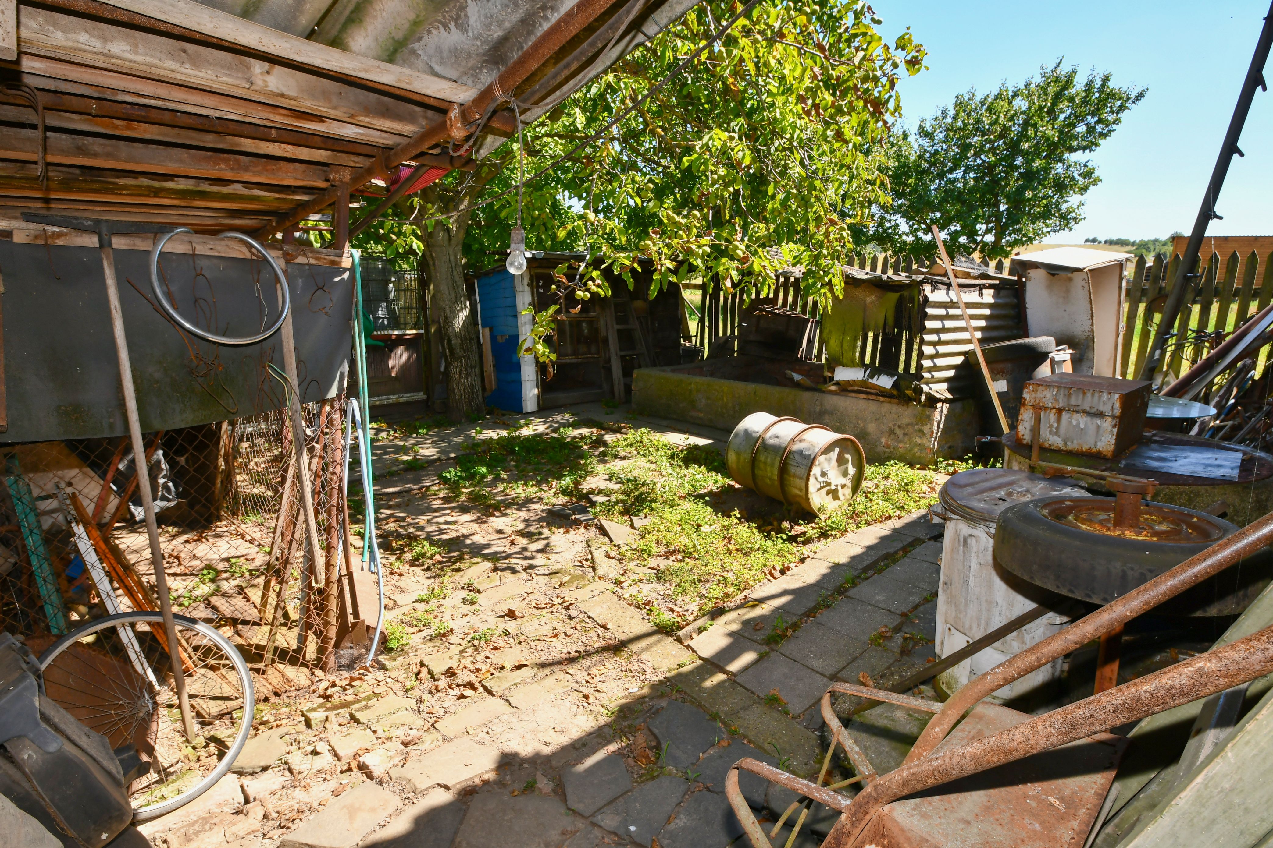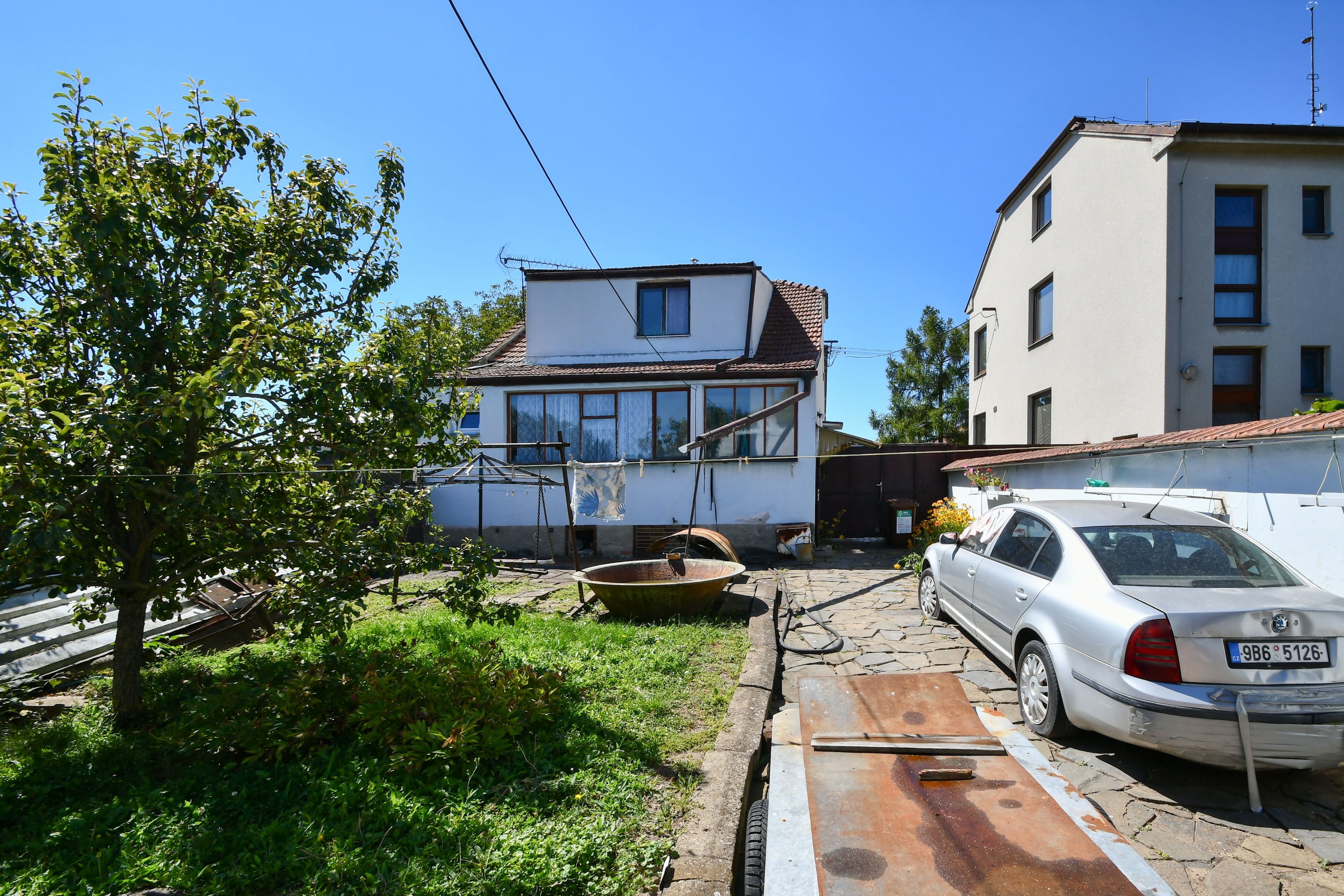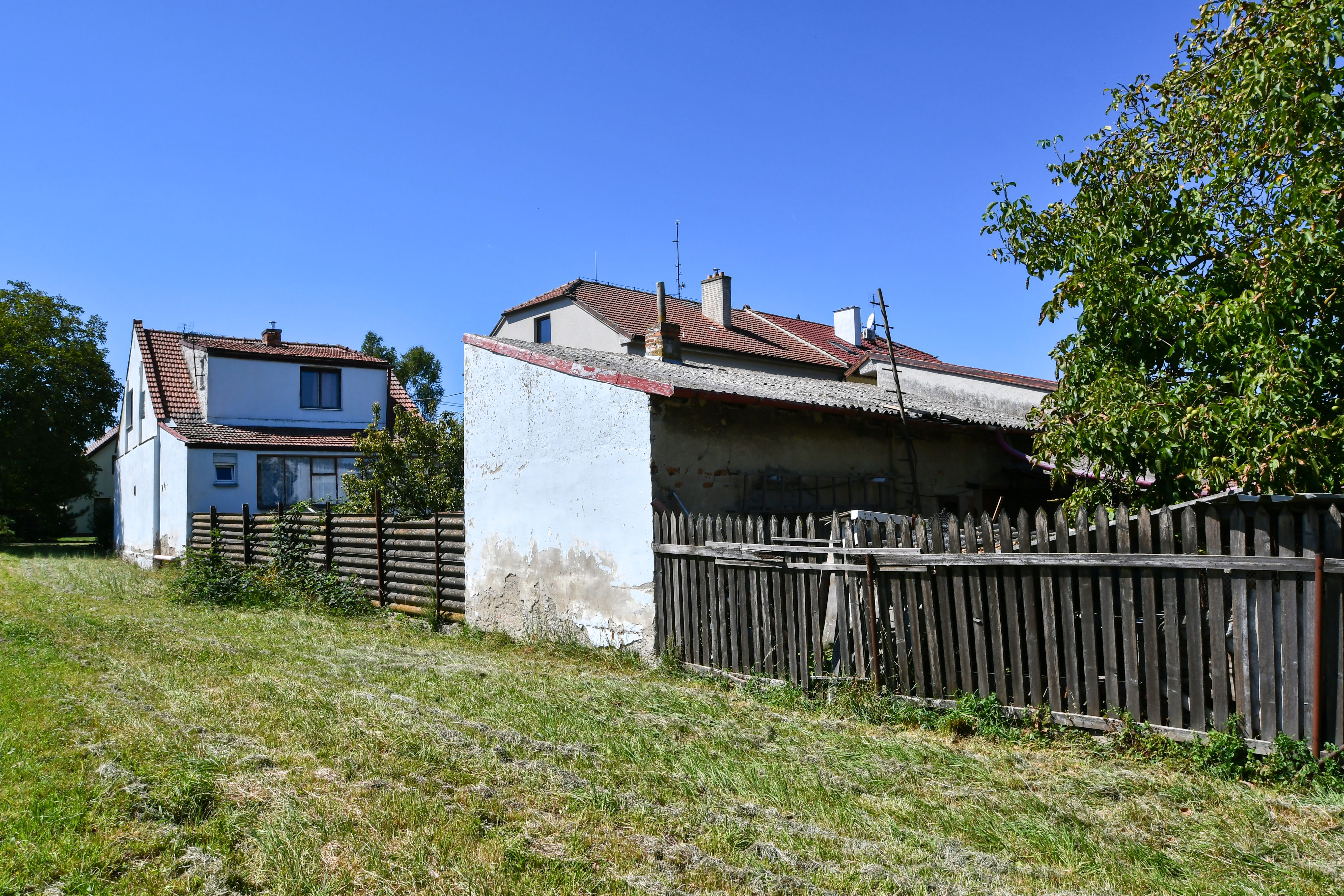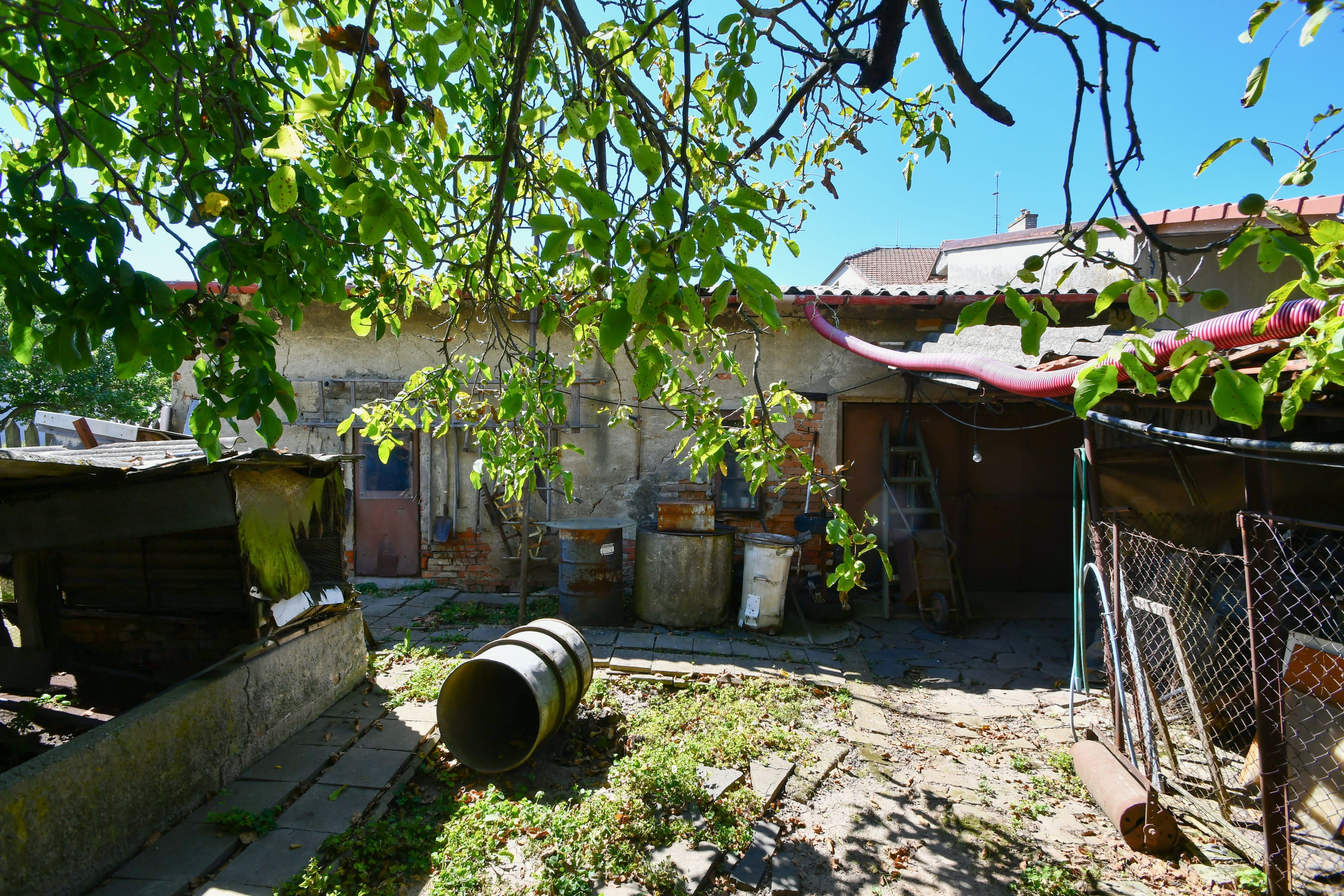 K domu náleží dvůr a hospodářská budova s průjezdem vhodným k parkování, oddělujícím dvorní část od pozemku se zahradou. K dispozici je zde také dílna a prádelna.