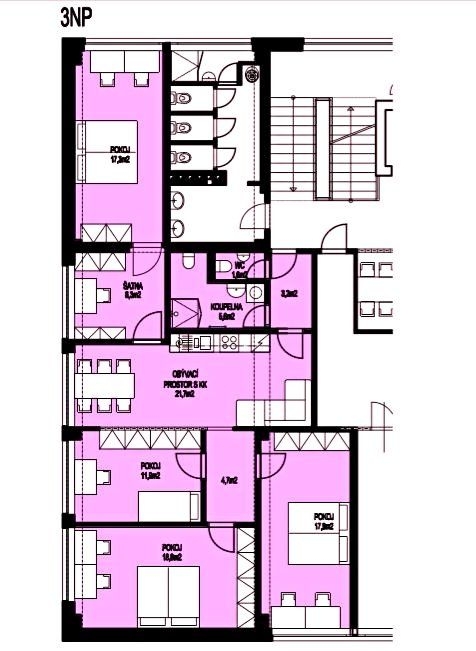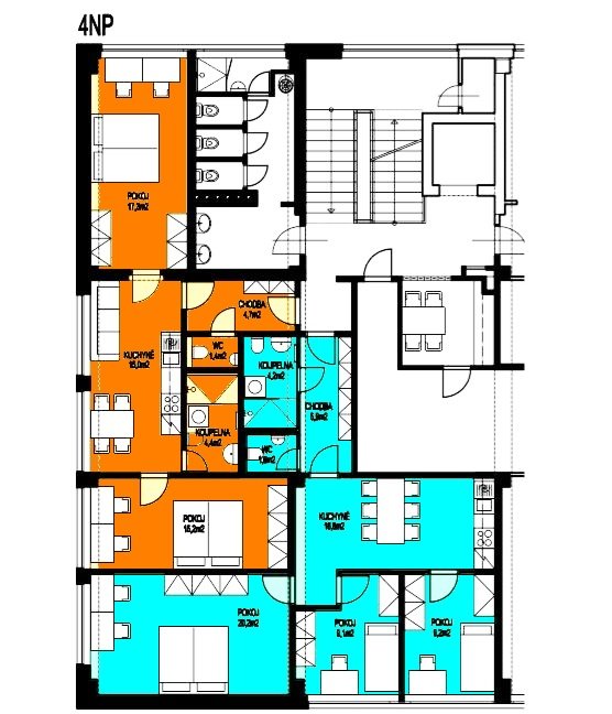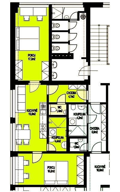 Jednotlivé pokoje mají samostatné vchody. Kuchyně a sociální zařízení v bytech jsou společné.