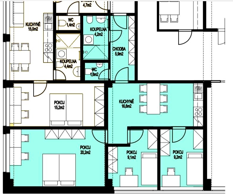 V bytech jsou nové koupelny s vanou, sprchovým koutem a umyvadlem, nové WC.V kuchyni nová kuchyňská linka, lednice, pračka.
