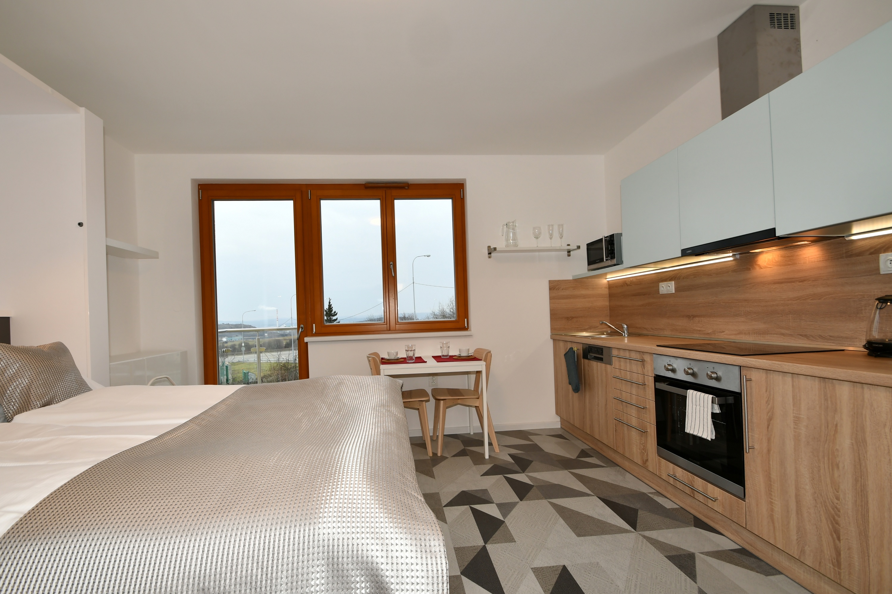 Dřevěná okna s trojskly doplňují elektricky ovládané předokenní žaluzie VEKRA, které zajišťují soukromí a akustický komfort. V bytě jsou vinylové podlahy.